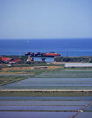 この日は風が強く海が荒れていたので線路から離れて撮ってみました。ケープルが邪魔なんだよぉ〜。(魂の叫び)
