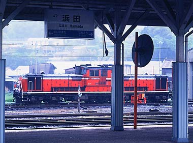 浜田駅でのカットです。これは動き出した直後のシーンです。庫の中ではなく、いつもこの辺に留置していました。
