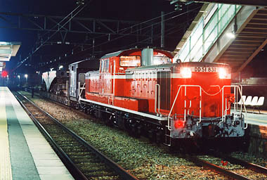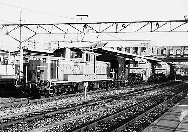93/02/09、福知山線広野駅でのシーンです。後ろは「ヨ8404+シキ611B」と続きます。手すりがカマ本体に写り込むほどピカピカです!