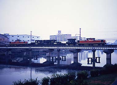 95/09/10でカットで城東貨物線の神崎川です。編成は写真の右側、吹田方から「831+ヨ8188+シキ610B+836」です。片町線の大住までの運転で、駅近くの踏切上で荷を降ろしました。そのシーンもバルブ撮影したのですが、現場は引きの取れない所でイマイチ…そしてこの写真もイマイチです。原版は見れたものではありません。なにしろ露出がナイ。快晴だったらもっとマシに撮れたのでしょうが当日は薄曇、RDP2の倍増感でも1/125の開放という有り様。潔くポジを諦めネガで撮れば良かったかも?