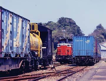 DD51・コキ・タキ・ヨが鵜殿駅構内に勢揃い。編成が入換動車に引っ張られてカマから外れ、専用線に取り込まれる瞬間に展開されるシーンです。右側のコキ数車は到着した分ではなくて、発送される分です。