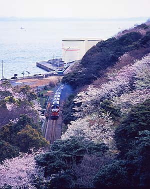 撮影場所は信号所内です。列車はこの位置で停まってくれれば良いのですが、もう少し進行して停止します。後ろに写っているのは瀬戸大橋です(嘘)。これだけ桜が遠くなってしまうと別に桜の時期でなくてもよい写真ですな。左の斜面も桜が咲けば良いのですが…。