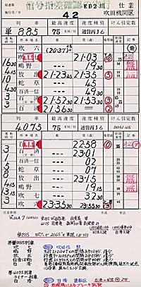 乗務員が携帯する運転時刻表です。正式名称を知らないけど、スタフと言うのでしたっけ?部品即売会で1枚100円で購入しました。これはちゃんとプラスチックのケースに入っていましたが、中の紙だけのモノでも100円だったのは納得いか〜ん(笑)。