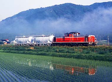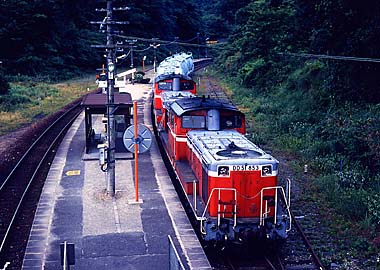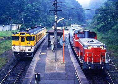 天気がいい日もあったのですが、やっぱりというか当然というか、この地方名物のキリに悩まされました。地福発車くらいの時間になるとキリが晴れる「とき」もあり、この辺は普段のおこないが出るといった所でしょうかねぇ(笑)。98/5/15。