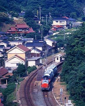 岡見駅の俯瞰2点です。左は同駅を益田方から見た「重連+4両」、右は米子方から見た「単機+2両」です。重連運転は6月に入ってから始まりました。